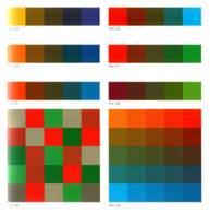 | Контраст дополнительных цветов Мы называем два цвета дополнительными, если их пигменты, будучи смешанными, дают нейтральный серо-чёрный цвет. В физике два хроматических света, которые при смешивании дают белый свет, также считаются дополнительными. Два дополнительных цвета образуют странную пару. Они противоположны друг другу, но нуждаются один в другом. Расположенные рядом, они возбуждают друг друга до максимальной яркости и взаимоуничтожаются при смешивании, образуя серо-чёрный тон, как огонь и вода. Каждый цвет имеет лишь один единственный цвет, который является по отношению к нему дополнительным. В цветовом круге на рисунке 3 дополнительные цвета расположены диаметрально один другому. Они образуют следующие пары дополнительных цветов: жёлтый - фиолетовый жёлто-оранжевый - сине-фиолетовый оранжевый - синий красно-оранжевый - сине-зелёный красный - зелёный красно-фиолетовый - жёлто-зелёный. Если мы проанализируем эти пары дополнительных цветов, то найдём, что в них всегда присутствуют все три основных цвета: жёлтый, красный и синий: жёлтый - фиолетовый = жёлтый, красный + синий; синий - оранжевый = синий, жёлтый + красный; красный - зелёный = красный, жёлтый + синий. Подобно тому, как смесь жёлтого, красного и синего даёт серый, так и смесь двух дополнительных цветов так-же превращается в вариант серого цвета. Можно вспомнить также опыт из раздела "Физика цвета", когда при исключении одного из цветов спектра все остальные цвета, будучи смешанными, давали его дополнительный цвет. Для каждого из цветов спектра сумма всех остальных образует его дополнительный цвет. Физиологически доказано, что как и явление остаточного изображения, так и симультанный контраст иллюстрируют удивительный и до сих пор необъяснимый факт появления в наших глазах при восприятии того или иного цвета одновременно и другого, уравновешивающего его дополнительного цвета, который в случае его реального отсутствия спонтанно генерируется в нашем сознании. Это явление весьма важно для всех практически работающих с цветом. В разделе "цветовая гармония" было установлено, что закон дополнительных цветов является основой гармоничности композиции, потому что при его соблюдении в глазах создаётся ощущение полного равновесия. Дополнительные цвета, в их пропорционально правильном соотношении, придают произведению статически прочную основу воздействия. При этом каждый цвет остаётся неизменным в своей интенсивности. Впечатления, производимые дополнительными цветами, идентичны сущности собственно самого цвета. Эта статистическая сила воздействия дополнительных цветов играет особо важную роль для настенной живописи. Однако помимо этого каждая пара дополнительных цветов обладает и другими особенностями. Так, пара жёлтый-фиолетовый представляет собой не только контраст дополнительных цветов, но и сильный контраст светлого и тёмного. Красно-оранжевый - сине-зелёный это также не только пара дополнительных цветов, но одновременно и чрезвычайно сильный контраст холодного и тёплого. Красный и дополнительный к нему зелёный одинаково светлы и обладают одинаковой цветовой яркостью. Чтобы яснее усвоить элементарную сущность контраста дополнительных цветов, приведём несколько следующих упражнений. ![]() На рисунках 23-28 представлены три пары дополнительных цветов 
